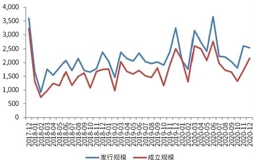 图1 2017年12月-2020年12月信托产品发行规模与成立规模(亿元)