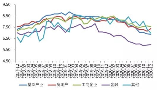 从分项成立收益率来看,金融和房地产投向平均收益率有所上升,环比分别上涨4bp和24bp,分别至5.96%和7.39%。基础产业和工商企业投向平均收益率则有所降低,其中基础产业投向平均收益率环比下降3bp,至6.88 %;工商企业投向平均收益率环比下降8bp,至7.55%。本期除房地产投向收益率有较大幅度上涨之外,其余投向收益率相较稳定。