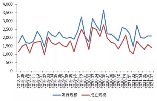 图1 2018年7月-2021年7月信托产品发行规模与成立规模(亿元)