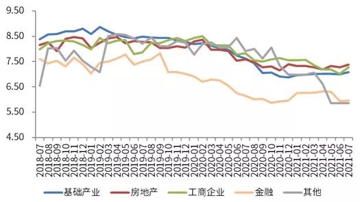 从分项成立收益率来看,金融投向收益率基本保持平稳,地产及工商企业投向平均收益率则有所上升。房地产投向平均收益率为7.37%,较上期上升10bp;工商企业投向平均收益率为7.28%,较上期上升27bp;基础产业投向平均收益率为7.09%,较上期上升9bp;金融投向平均收益率为5.96%,较上期上升2bp。