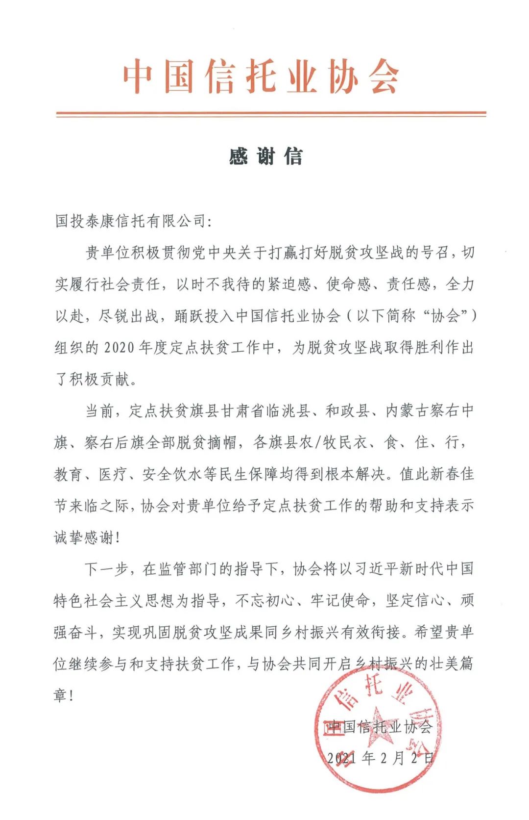 日期: 2021-02-09近日,国投泰康信托收到来自中国信托业协会的一封感谢信。信中,中国信托业协会对国投泰康信托踊跃投入到协会组织的2020年度定点扶贫工作,为脱贫攻坚作出的贡献表示诚挚的感谢!