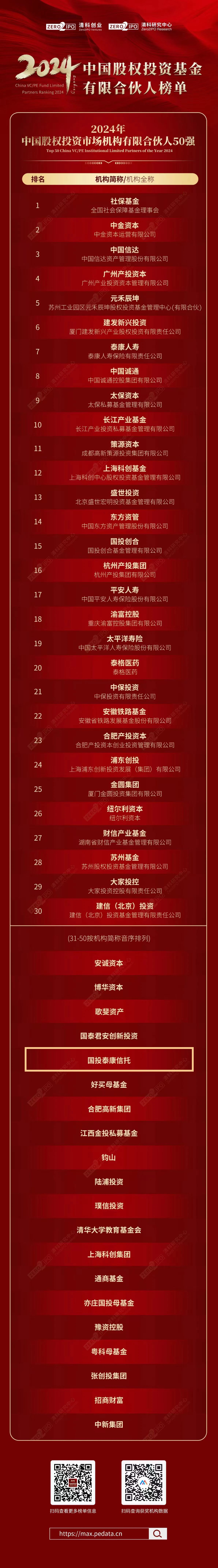 国投泰康信托荣获清科2024年中国股权投资市场机构有限合伙人50强