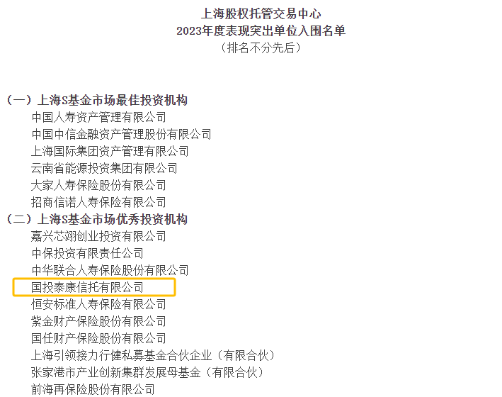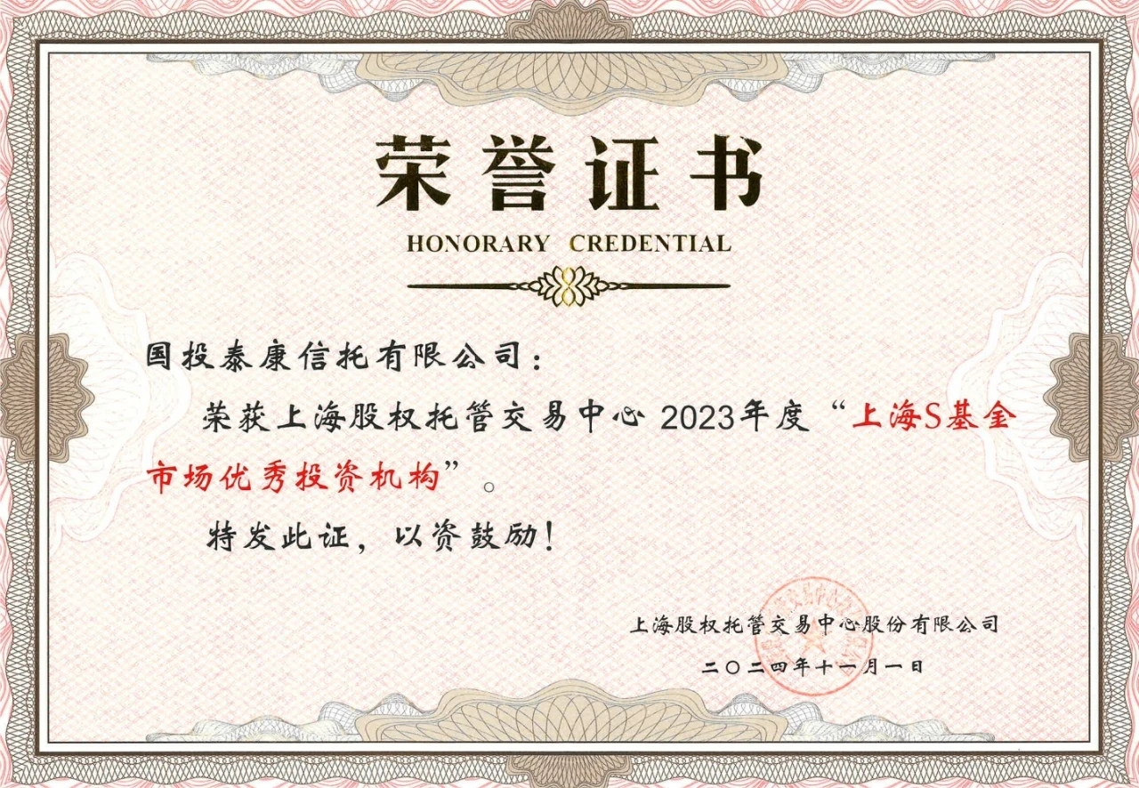 国投泰康信托荣获上海股权托管交易中心“2023年度上海S基金市场优秀投资机构”称号