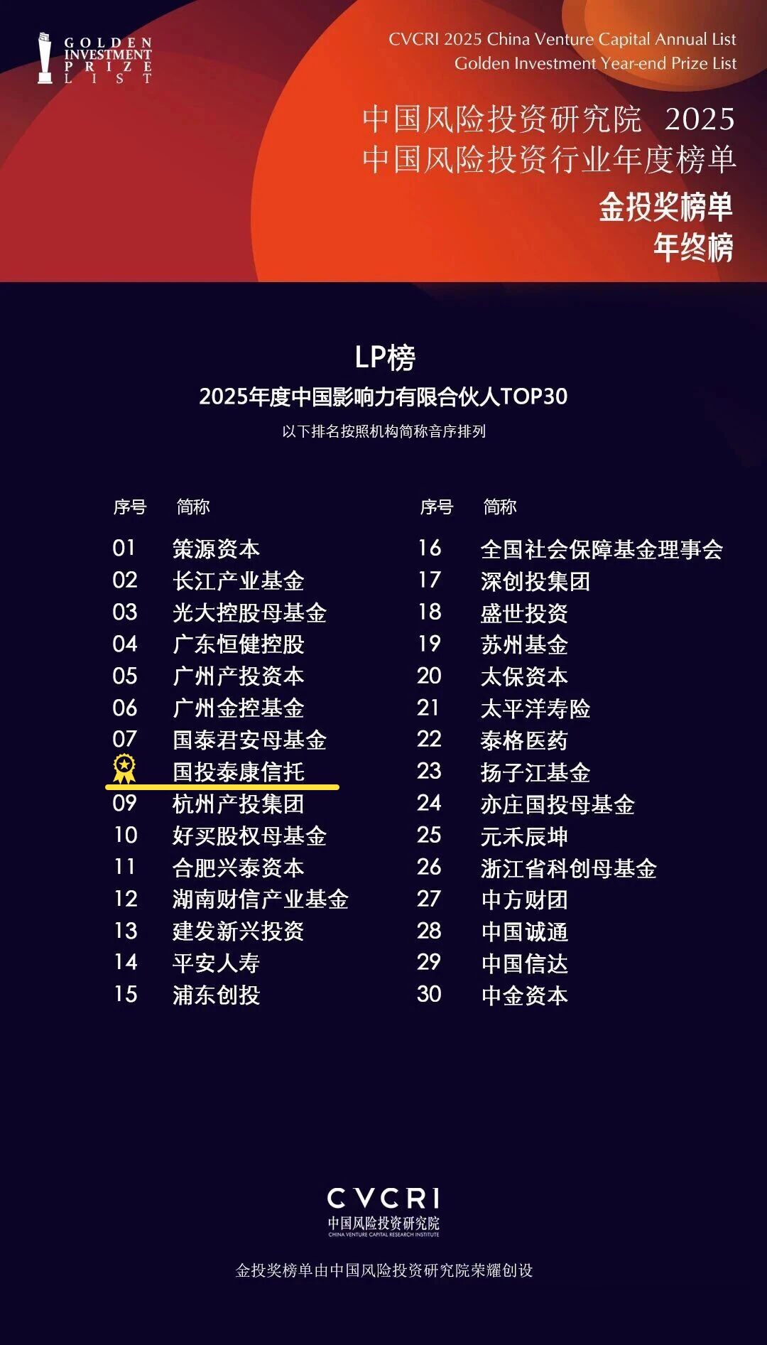 国投泰康信托荣获中国风险投资研究院2025中国风险投资行业年度榜单“2025年度中国影响力有限合伙人TOP30”